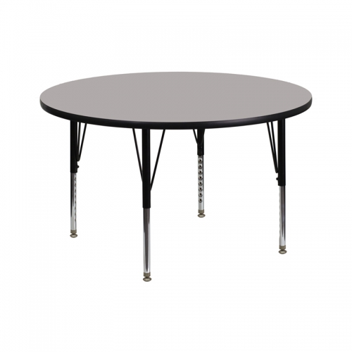 Flash Furniture's Pre-School XU-A42-RND-GY-H-P-GG warp resistant high pressure laminate round activity table features a 1.25'' top and a high pressure laminate work surface. This Round High Pressure Laminate activity table provides an extremely durable (no mar, no burn, no stain) work surface that is versatile enough for everything from computers to projects or group lessons. Sturdy steel legs adjust from 16.25'' - 25.25'' high and have a brilliant chrome finish. The 1.25'' thick particle board top also incorporates a protective underside backing sheet to prevent moisture absorption and warping. T-mold edge banding provides a durable and attractive edging enhancement that is certain to withstand the rigors of any classroom environment. Glides prevent wobbling and will keep your work surface level. This model is featured in a beautiful Grey finish that will enhance the beauty of any school setting. [XU-A42-RND-GY-H-P-GG] FL-XU-A42-RND-GY-H-P XU-A42-RND-GY-H-P