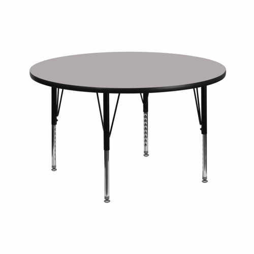 Flash Furniture's Pre-School XU-A42-RND-GY-T-P-GG warp resistant thermal fused laminate round activity table features a 1.125'' top and a thermal fused laminate work surface. This Round Laminate activity table provides a durable work surface that is versatile enough for everything from computers to projects or group lessons. Sturdy steel legs adjust from 16.125'' - 25.125'' high and have a brilliant chrome finish. The 1.125'' thick particle board top also incorporates a protective underside backing sheet to prevent moisture absorption and warping. T-mold edge banding provides a durable and attractive edging enhancement that is certain to withstand the rigors of any classroom environment. Glides prevent wobbling and will keep your work surface level. This model is featured in a beautiful Grey finish that will enhance the beauty of any school setting. [XU-A42-RND-GY-T-P-GG] FL-XU-A42-RND-GY-T-P XU-A42-RND-GY-T-P
