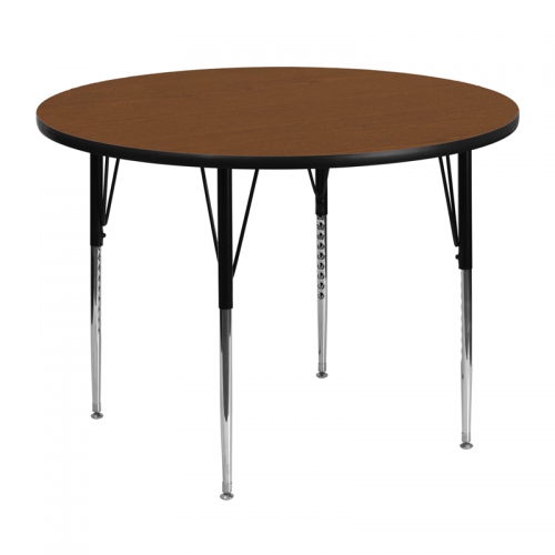Flash Furniture's XU-A48-RND-OAK-H-A-GG warp resistant high pressure laminate round activity table features a 1.25'' top and a high pressure laminate work surface. This Round High Pressure Laminate activity table provides an extremely durable (no mar, no burn, no stain) work surface that is versatile enough for everything from computers to projects or group lessons. Sturdy steel legs adjust from 21.25'' - 30.25'' high and have a brilliant chrome finish. The 1.25'' thick particle board top also incorporates a protective underside backing sheet to prevent moisture absorption and warping. T-mold edge banding provides a durable and attractive edging enhancement that is certain to withstand the rigors of any classroom environment. Glides prevent wobbling and will keep your work surface level. This model is featured in a beautiful Oak finish that will enhance the beauty of any school setting. [XU-A48-RND-OAK-H-A-GG] FL-XU-A48-RND-OAK-H-A XU-A48-RND-OAK-H-A