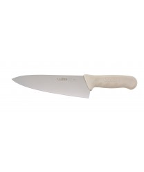Crafted from hard, stain-resistant X50 Cr Mo V15 German steel, this fantastic 8" cook's knife has a sturdy white polypropylene handle that offers a comfortable yet firm grip. The knife has a stay-safe finger guard, and it is NSF-approved.