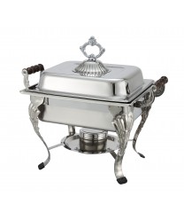 The Winco 508 Half Size Crown Chafer 4 Qt. can be partnered with the 8 Qt. Crown Chafer, or stand on its own. This square chafer is crafted from 18/8 stainless steel and has decorative legs, wooden side handles and a crown handle on the cover, that makes it very appealing and attractive on the buffet line. With a highly polished finish, this elegant half size chafer is sure to turn heads. This chafing dish set includes a water pan, food pan, dome cover and fuel holder to ensure even heat distribution.