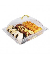Keep the contents of chafing dishes or acrylic trays on display with the Winco C-DPF2 Polycarbonate Half Size Dome Cover with Side-Cut. This break-proof polycarbonate cover fits half size food pans or trays, and will keep the contents covered while providing a side cut out opening for self-service. Its clever design means that your guests will be able see your culinary creations and even serve themselves, without lifting off the cover. This will help keep the food moist and fresh throughout your meal, and limit exposure to airborne contaminants. A convenient gold accented metal handle can assist your servers when refilling the pan or tray.