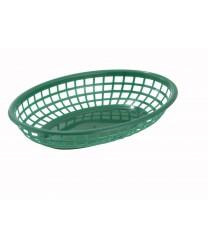 Perfect for outdoor cafes, bars or fast casual dining, the Winco PFB-10G Green Oval Fast Food Basket is a trendy way to serve burgers, fries, sandwiches and other foods. Made of durable plastic, this basket has a rugged construction that won't sag while holding food, and makes a fun and casual presentation on the dining table. It is also dishwasher safe and can be fitted with different types of napkins to protect the basket from grease or stains while presenting the food.