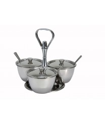 Ideal for serving all types of relishes, condiments, jams and more, the round Winco RS-3 3-Compartment Stainless Steel Relish Server will fit nicely on any dining table. Made of durable stainless steel, this condiment server has 3 bowls for holding your favorite condiments and comes with 3 small serving spoons to dish out controlled portions of condiments.