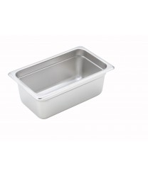 For serving smaller items, the NSF listed Winco SPJH-404 1/4 Size Anti-Jam Steam Table Pan, 4'' Deep is the perfect addition to any steam table configuration. Constructed of sturdy, heavy-duty 22 gauge 18/8 stainless steel, this pan will not bend, warp or corrode, and will maintain it's shape and shine over time. In addition, it's anti-jam features allow for ample space between pans, enabling your servers to easily remove and refill these pans as needed.