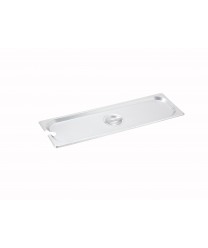 Use the Winco SPJL-HCN Half Long Size Notched Steam Table Pan Cover for half-sized long sized steam table pans to keep in heat and keep out contaminants. Half long size steam table pans can be used along with (2) 1/4 size pans, (3) 1/6 size pans and so on to create the steam table configuration of your choice, Long half size covers are air-tight and snug and feature a slot for serving utensils and a handle for easy use.