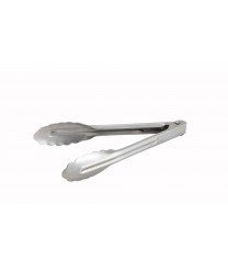 Designed for home or commercial use, the Winco UT-7 Coiled Spring Heavyweight Stainless Steel Utility Tong 7" will have many uses in your kitchen. Made of durable 1 mm thick stainless steel, these tongs are suitable for tasks such as sauteing vegetables on the stove or tossing and serving salads on the serving line. With their scalloped edge, hinge design and spring loaded mechanism, these tongs can easily grasp and transfer food to the plate without causing waste. Its one-piece construction also means that it is easy to clean and maintain.