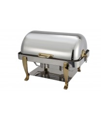 The Winco 108A Full Size Oblong Vintage Chafer 8 Qt., is perfect for upscale catered events, hotels and restaurants. Constructed from heavy duty and durable 18/10 stainless steel, this chafing dish features solid brass gold handles and legs resting on an elegantly constructed chafing frame. This sturdy and elegant high-end chafer promises on-going use and long-lasting durability. The roll top cover can be opened and stopped at 90 degree and 160 degree angles so food handling is made simple for self-service, or for service by the server sfaff. The sophisticated design and workmanship of this chafer makes it a fanatastic choice for any upscale event. This chafing dish set includes roll top lid, food pan, water pan, chafing frrame and two fuel holders for even heat distribution.