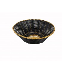 The Winco PWBK-8R Round Black / Gold Poly Woven Basket is a superb way to present rolls, sliced fresh bread, muffins and lots more directly on the table at catered events, restaurants and cafes. Made of durable polypropylene with gold trimmed edges and a black woven ribbed design, this rattan-style basket can be used often without warping, or coming apart. Place a napkin inside and you can use this bread basket as a serving basket for French fries, tortilla chips, onion rings and an assortment of other finger foods.